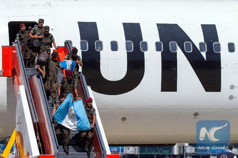 File Photo: Guatemala Army soldiers get off a United Nations (UN) plane, at Guatemalan Air Force facilities, in Guatemala City, capital of Guatemala, on March 11, 2015. (Xinhua/Luis Echeverria)