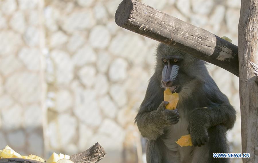A mandrill enjoys tropical fruit at the Yunnan Wild Animal Park in Kunming, capital of southwest China's Yunnan Province, Jan. 23, 2019. (Xinhua/He Chunhao)