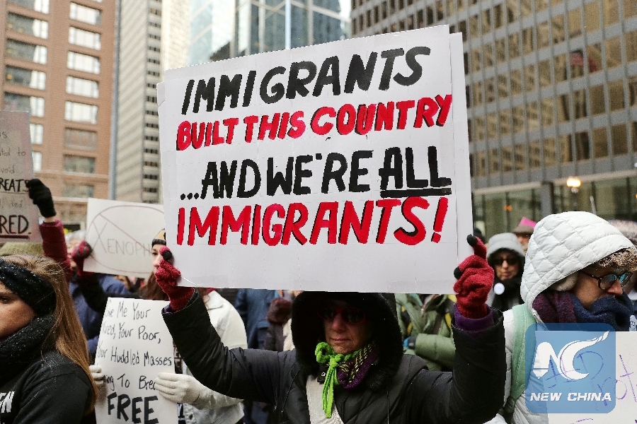 WASHINGTON, Feb. 18 (Xinhua) -- Demonstrations were held Monday in Washington, New York, Chicago and dozens of other U.S. cities against President Donald Trump's emergency declaration aimed to secure funding for the highly controversial U.S.-Mexico border wall.