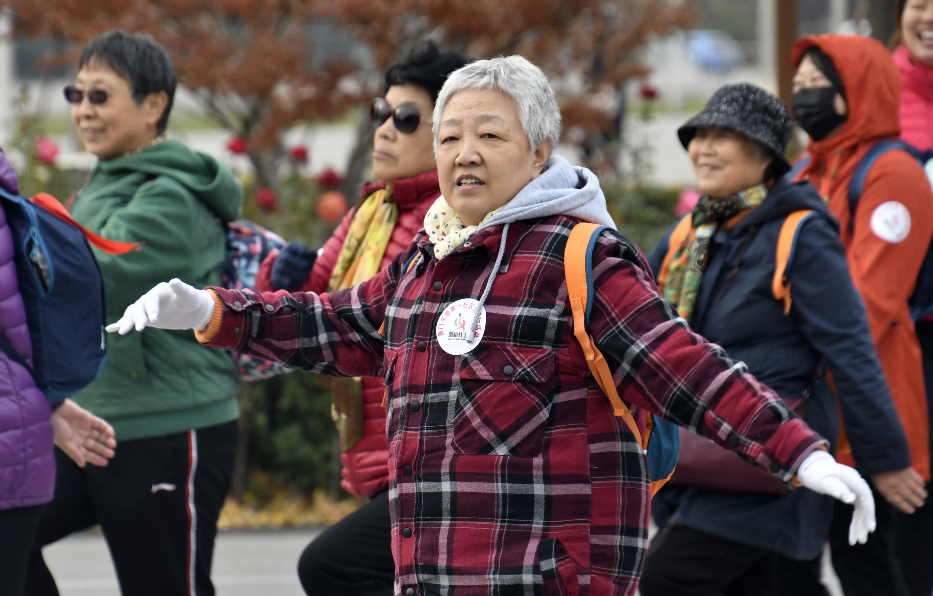 The elderly warm up before excercise in Beijing's Fengtai District. (Xinhua/Li Xin)