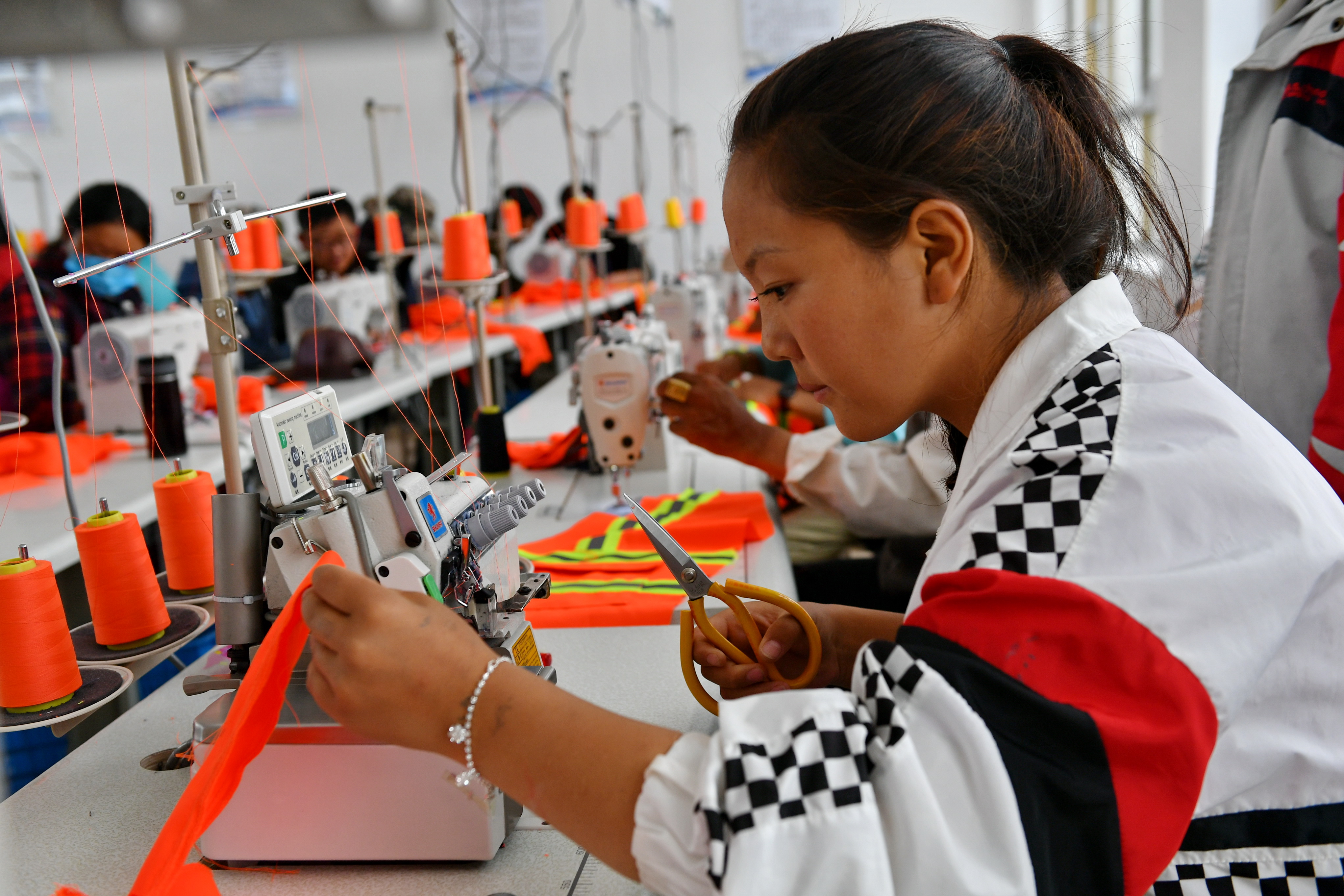 A local woman works at a sewing workshop in Gar County of Ngari Prefecture, southwest China's Tibet Autonomous Region, July 31, 2018. (Xinhua)