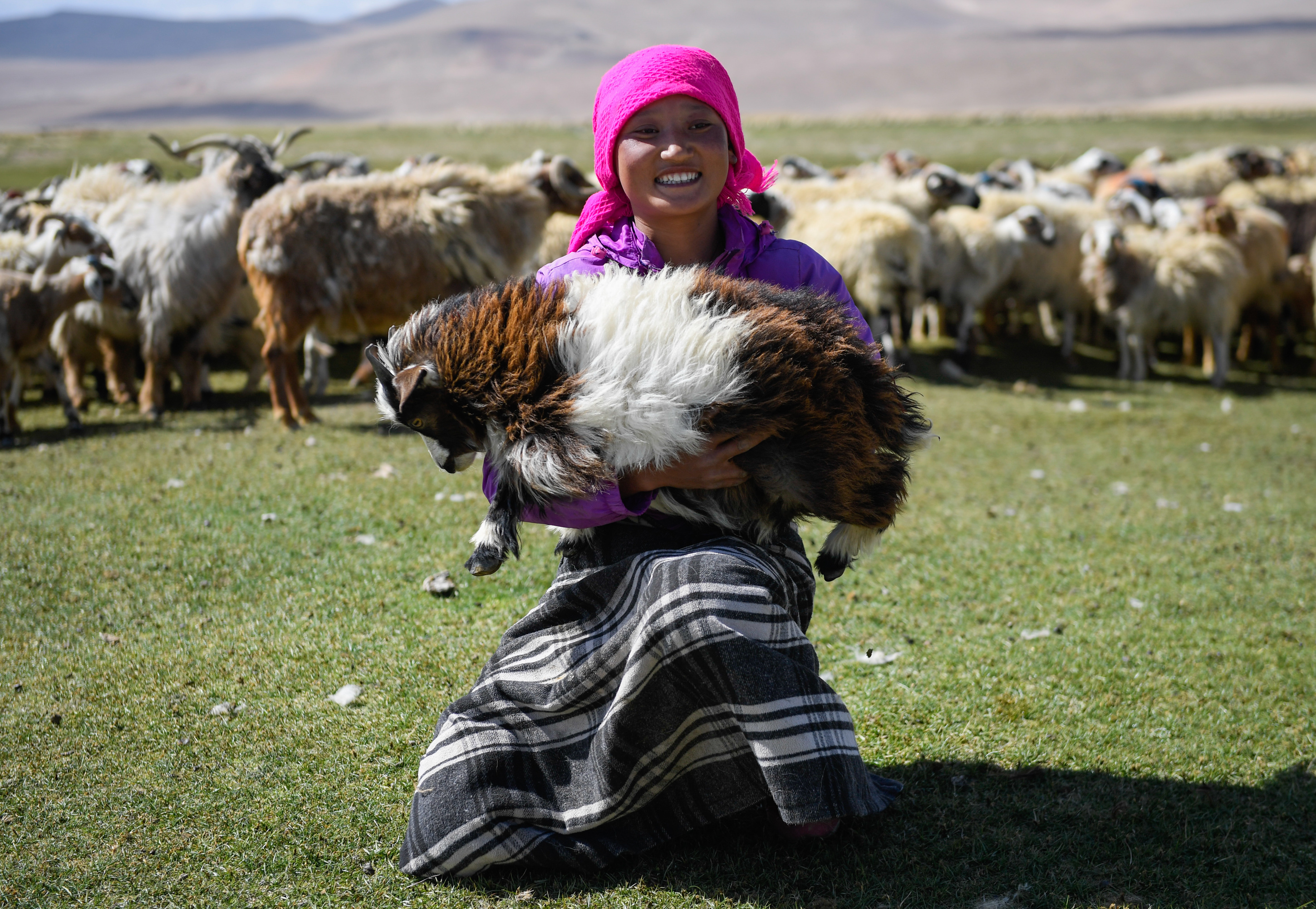 A woman holds a goat for shearing in Tangxi Village, Xigaze, southwest China's Tibet Autonomous Region, June 22, 2018. (Xinhua)