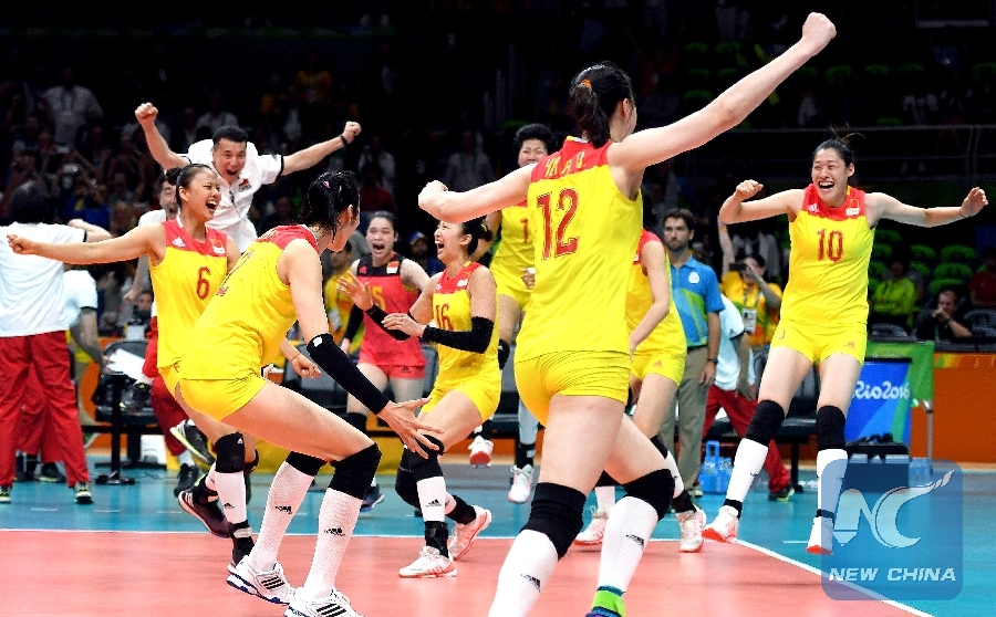 Jenny Lang Ping's Chinese women's volleyball team celebrates for winning the Rio Olypic Games gold medal after the victorious final over Serbia in Rio de Janeiro, Brazil on Aug. 20, 2016. (Li Ga/Xinhua)