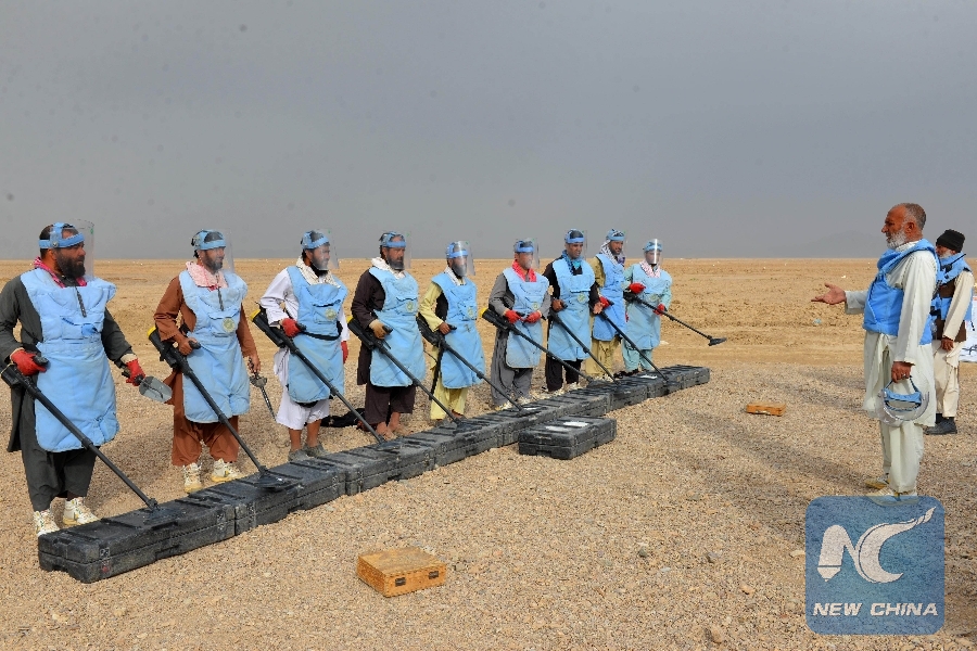 File Photo: Afghan deminers search for land mines in Zhari district of southern Kandahar province, Afghanistan, March 19, 2018. (Xinhua/Sanaullah Seaim)