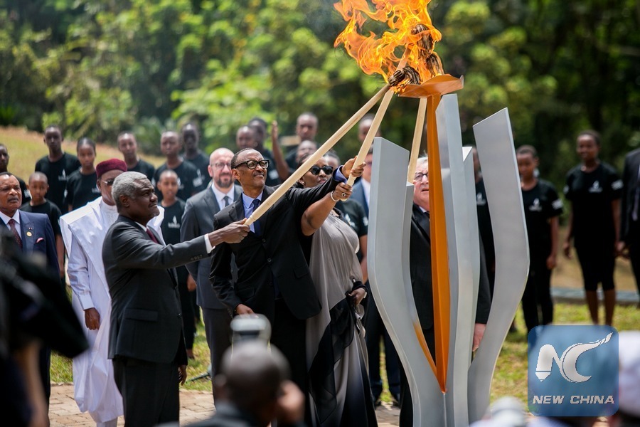 Kagame, Rwandan first lady Jeannette Kagame, Faki and Juncker jointly lit the flame of remembrance at the memorial.