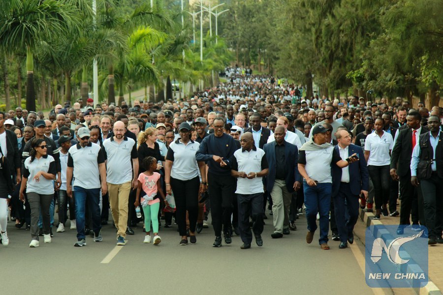 Rwandan President Paul Kagame (C, Front), guests and young people participate in a Walk to Remember event to commemorate the 25th anniversary of the 1994 genocide, in Kigali, capital of Rwanda, on April 7, 2019.(Xinhua/Cyril Ndegeya)