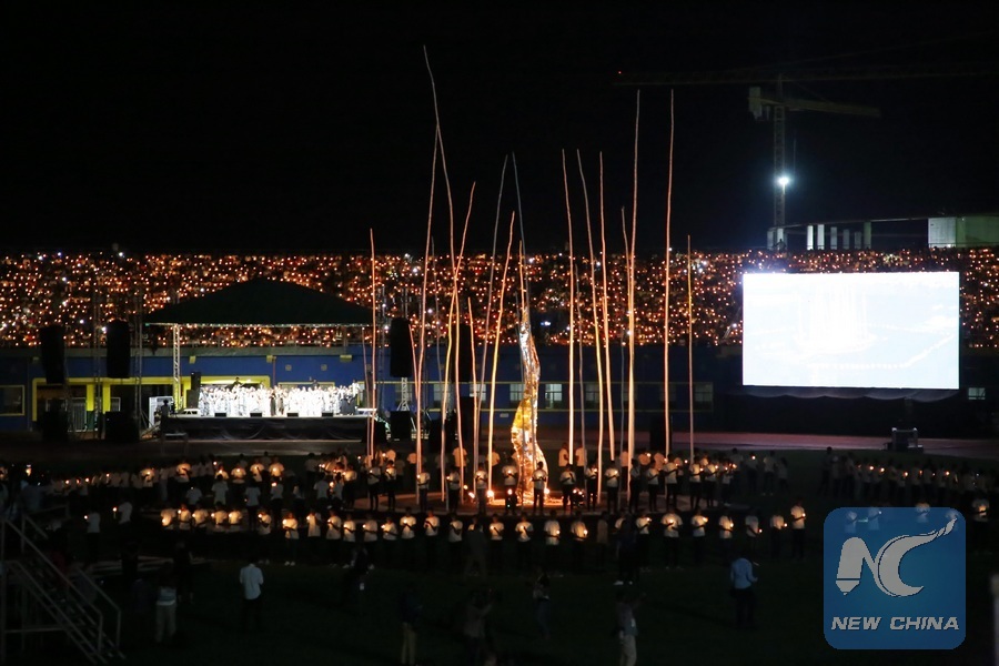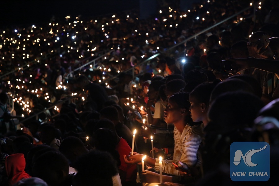 Rwandan people hold candles at a night vigil to commemorate the 25th anniversary of the 1994 genocide, in Kigali, capital of Rwanda, on April 7, 2019. (Xinhua/Lyu Tianran)