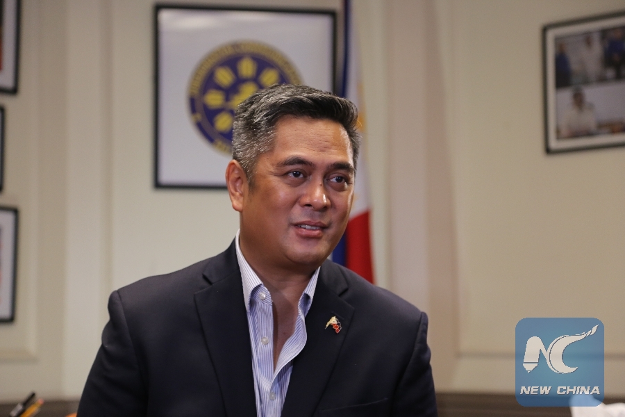 Philippine Communications Secretary Martin Andanar, also chief of the Philippine Presidential Communications Operations Office, is interviewed by Xinhua News Agency at his office in Manila, Philippines, May 7, 2019. (Xinhua/Yuan Mengchen)
