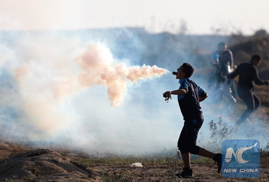 File Photo: A Palestinian protester holds a tear gas canister fired by Israeli troops in his mouth during clashes on the Gaza-Israel border, east of al-Bureij refugee camp in central Gaza, on April 12, 2019. (Xinhua/Yasser Qudih)