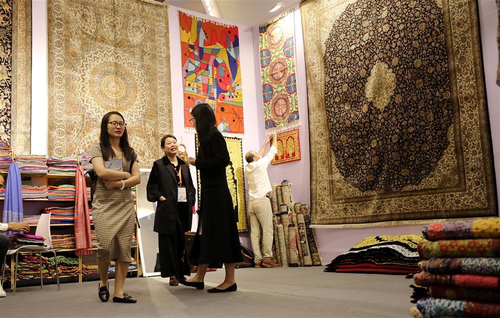 People visit a blanket booth in Shanghai, east China, May 31, 2019. The Belt and Road Brand Expo 2019 kicked off at Shanghai Exhibition Center in Shanghai Friday. (Xinhua/Fang Zhe)