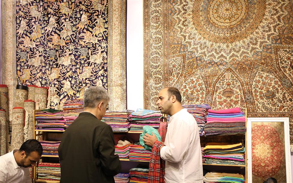 An exhibitor (R) introduces silk scarves to a visitor in Shanghai, east China, May 31, 2019. The Belt and Road Brand Expo 2019 kicked off at Shanghai Exhibition Center in Shanghai Friday. (Xinhua/Fang Zhe)