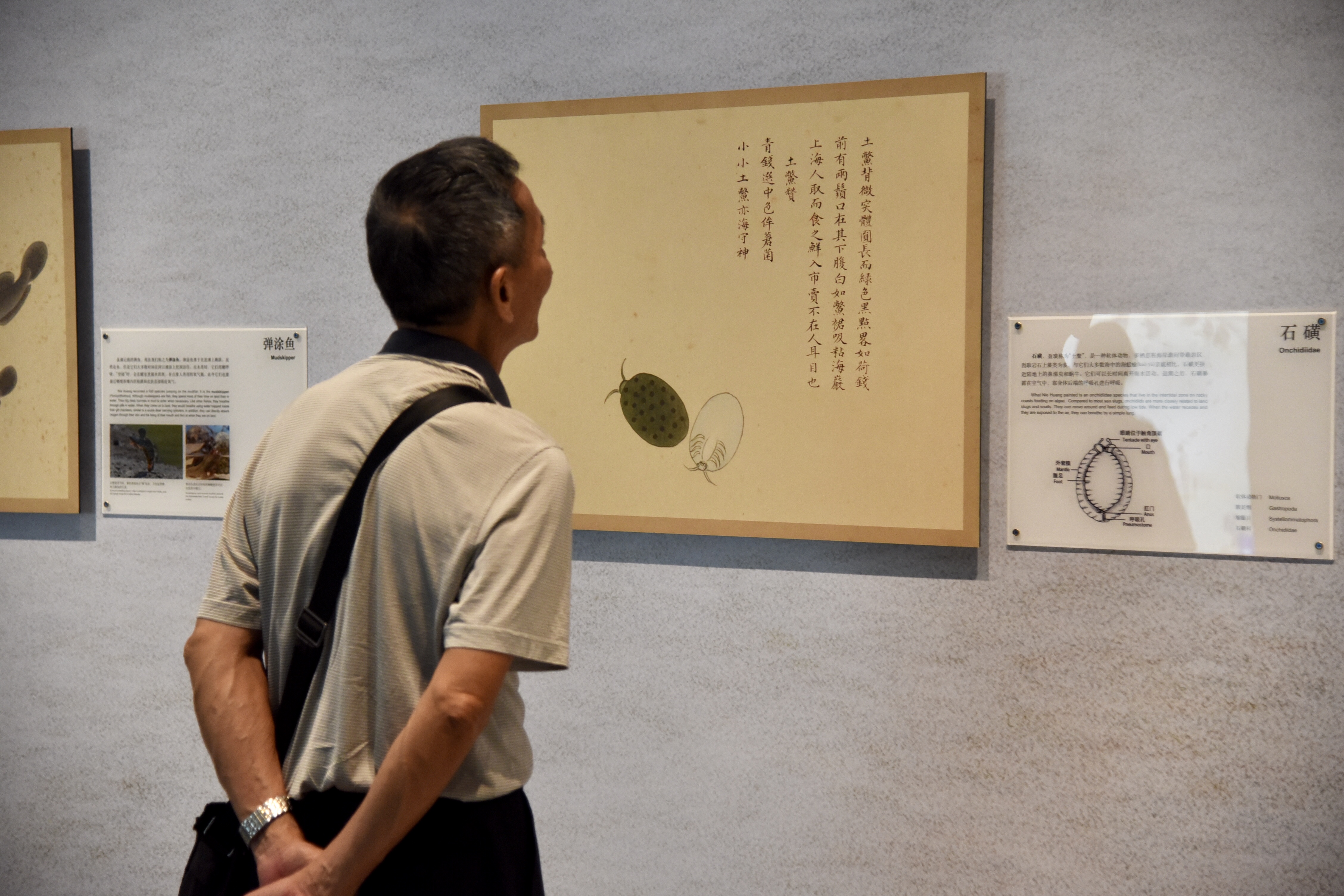 A visitor is looking at a picture at the exhibition "Marine Life in the Forbidden City" which opened on Friday in the southern Chinese city of Shenzhen. (Xinhua/Wang Xiaodan)