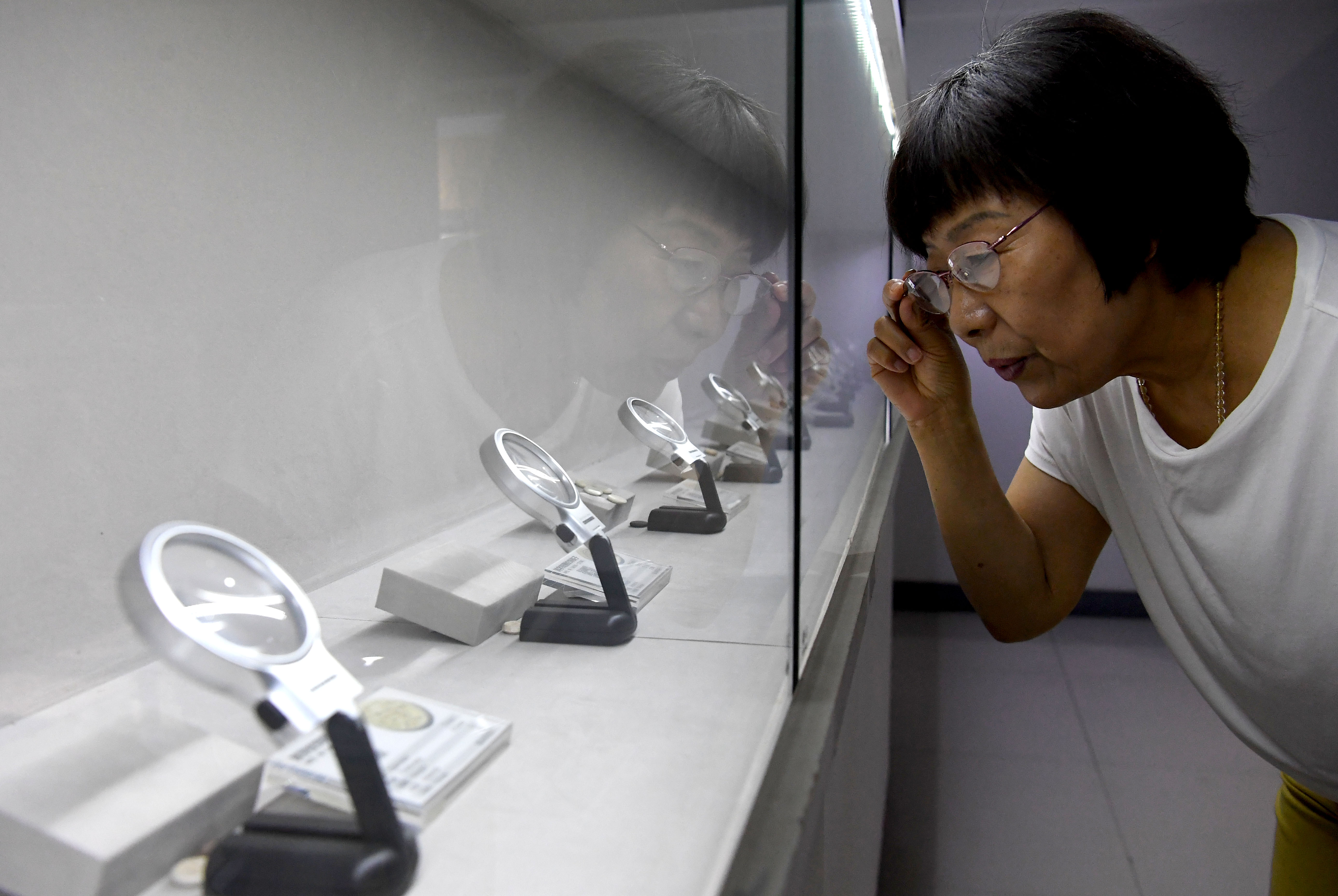 Wang Tongling views the exhibits displayed at the Go Museum in Luoyang, central China's Henan Province, May 14, 2019. (Xinhua/Li An)