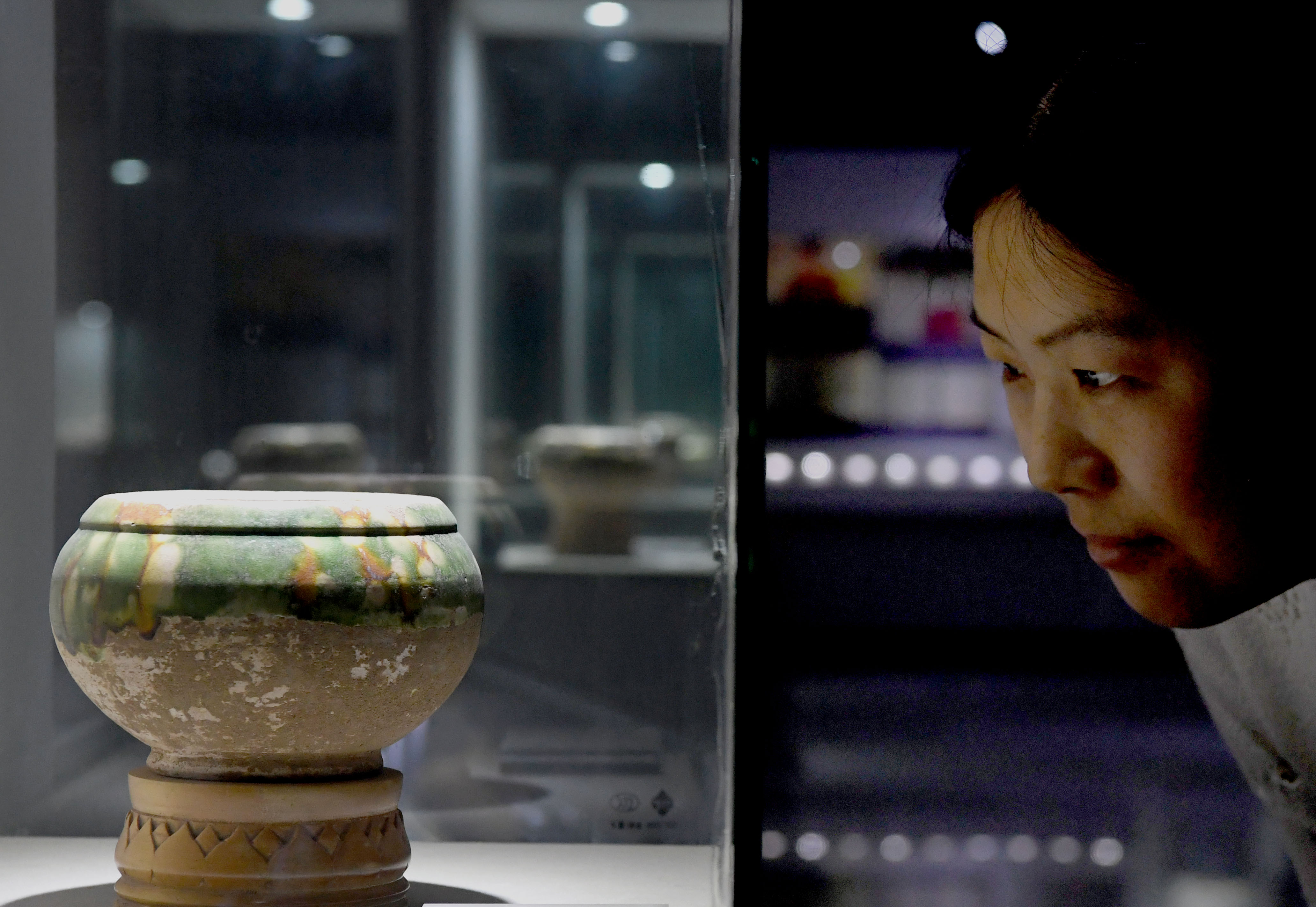 A visitor views a Go bowl displayed at the Go Museum in Luoyang, central China's Henan Province, May 14, 2019. (Xinhua/Li An)