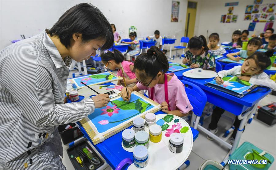 Kids learn painting during an extracurricular class in Dachang Hui Autonomous County, north China's Hebei Province, July 17, 2019. Various activities are held to enrich the life of children during the summer vacation. (Xinhua/Li Xiaoguo)
