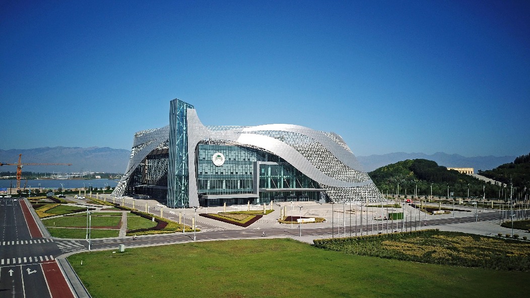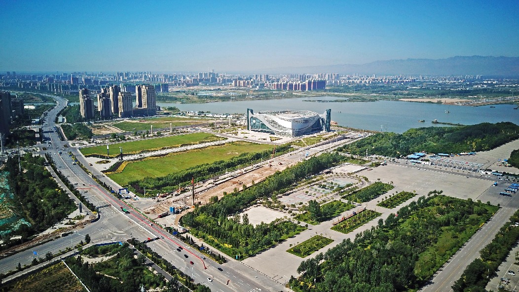 Aerial photo taken on Aug. 14, 2019 shows a view of Ningxia International Hall, the site of the fourth China-Arab States Expo, in Yinchuan, capital of northwest China's Ningxia Hui Autonomous Region. The fourth China-Arab States Expo opened Thursday in Yinchuan. (Xinhua/Wang Peng)