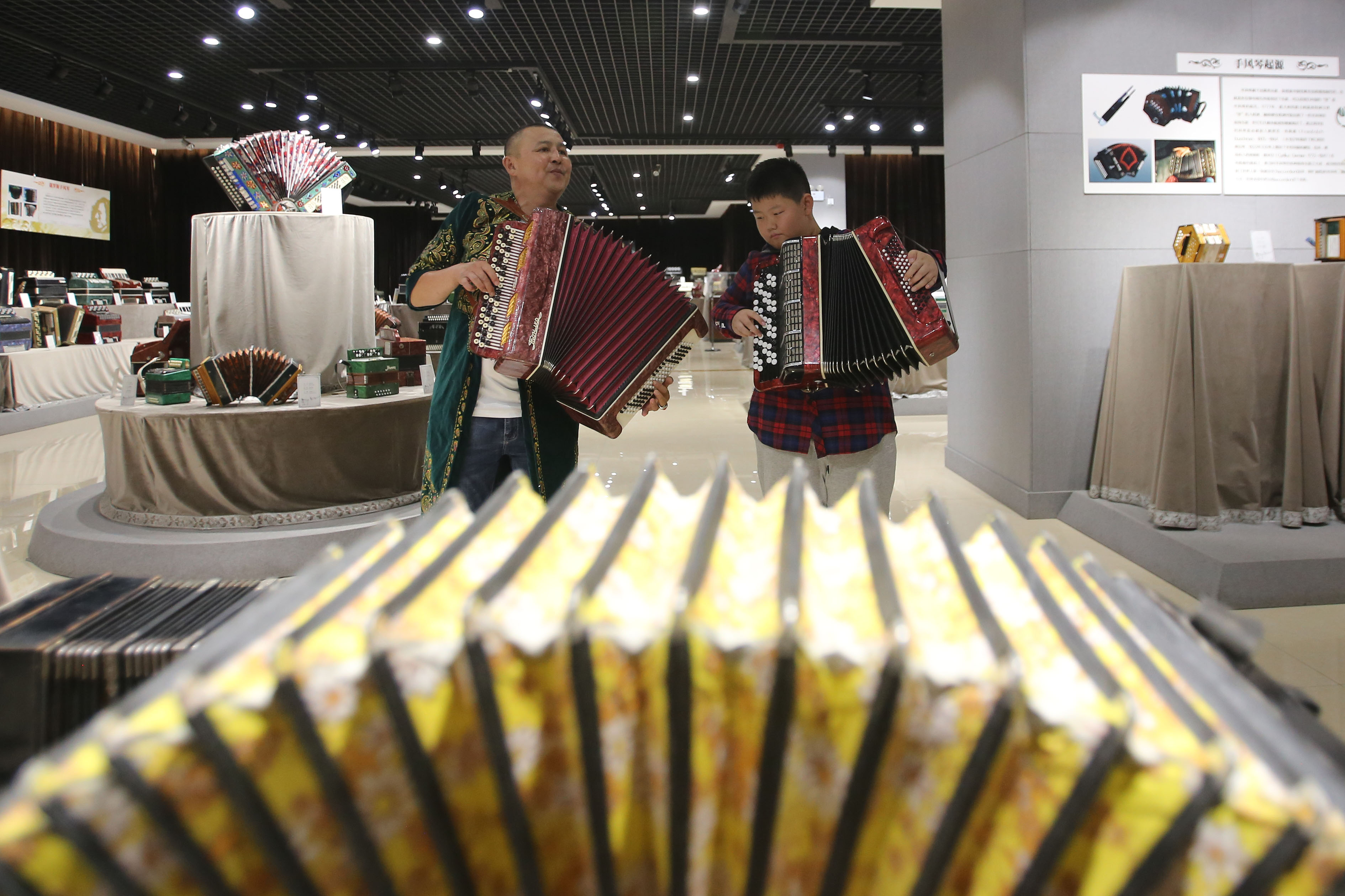 A staff and a pupil play the accordions at the Tacheng accordion museum, Sept. 4, 2019. (Xinhua/Sadat)