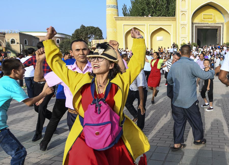 Tourists and local residents dance to music during Corban Festival celebrations in Kashgar, northwest China's Xinjiang Uygur Autonomous Region, Aug. 11, 2019. (Xinhua/Wang Fei)
