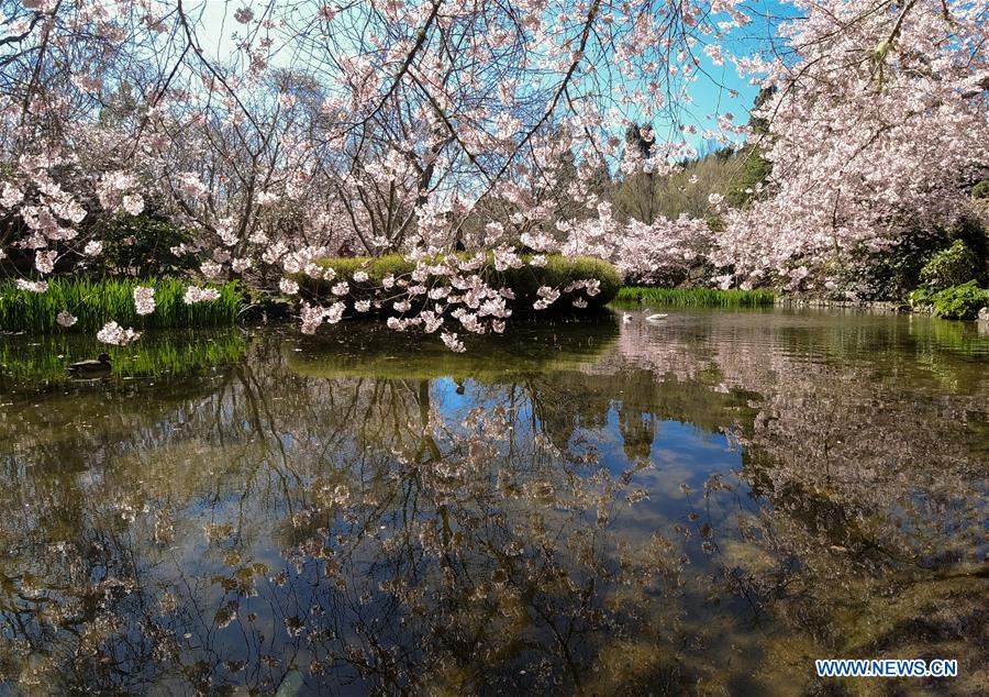 Photo taken on Sept. 22, 2019 shows cherry blossoms flourishing in the countryside of Wellington, New Zealand. New Zealand enters spring in the southern hemisphere. (Xinhua/Guo Lei)