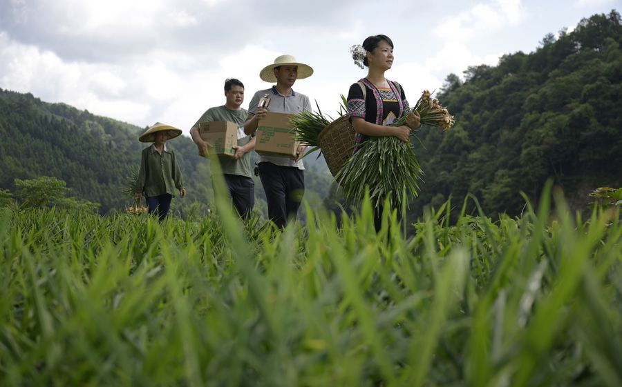 Shi Qiushi (R), a primary school teacher, harvests ginger in Longcheng Town of Tongdao Dong Autonomous County, central China's Hunan Province, Aug. 28, 2019. (Xinhua/Li Ga)