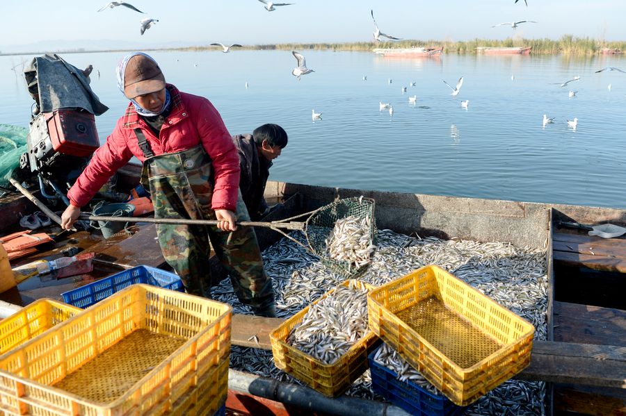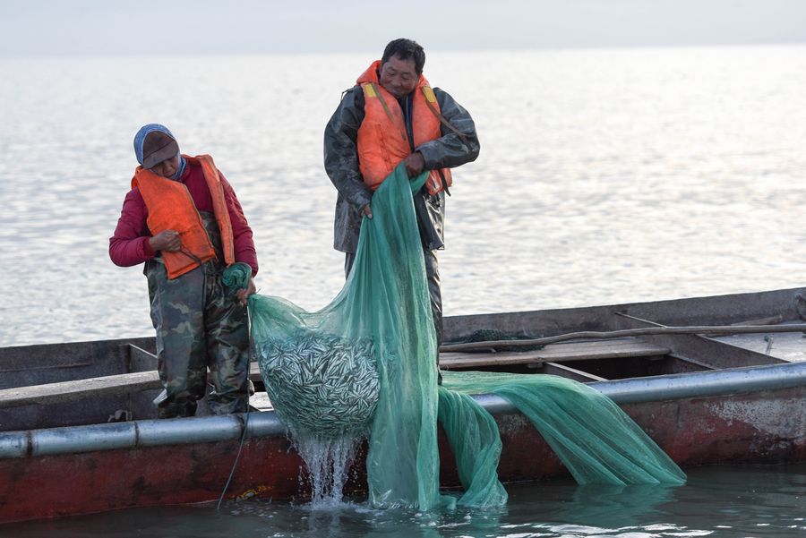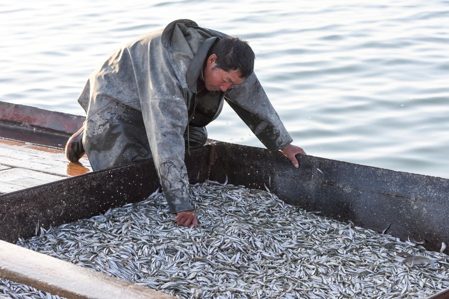 Fishermen of NW China's Xinjiang harvest pond smelt fish on Bosten Lake, which is China's largest inland freshwater lake.