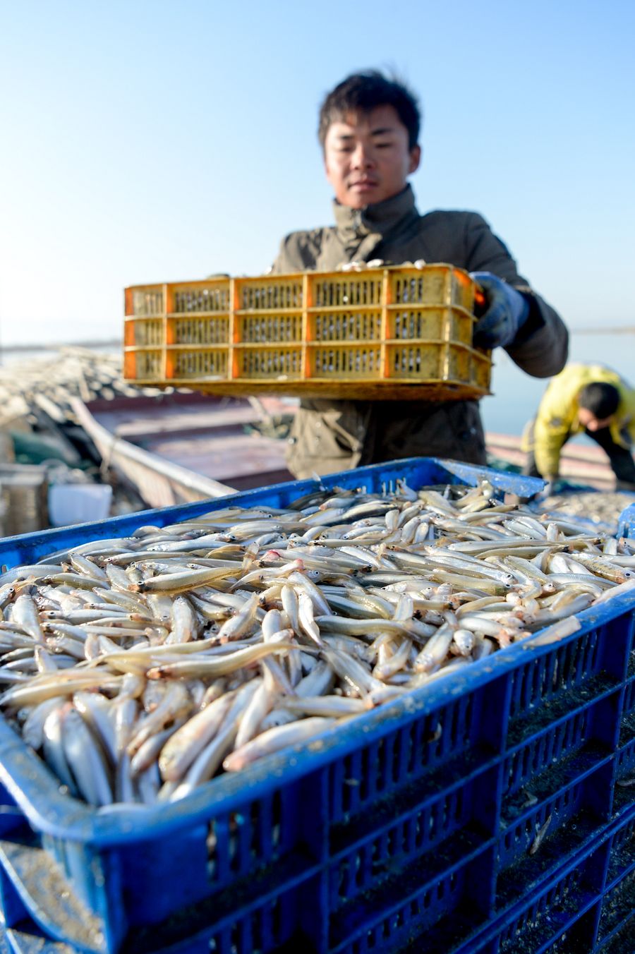 A local fisherman carries pond smelts harvested from Bosten Lake into baskets before having them weighed in Bohu County, northwest China's Xinjiang Uygur Autonomous Region, Oct. 12, 2019. (Xinhua/Ding Lei)