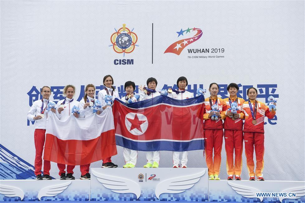 Gold medalists team of the Democratic People's Republic of Korea (DPRK), silver medalists team Poland and bronze medalists team China attend the awarding ceremony of the women's marathon team of track and field at the 7th CISM Military World Games in Wuhan, capital of central China's Hubei Province, Oct. 27, 2019. (Xinhua/Hu Huhu)