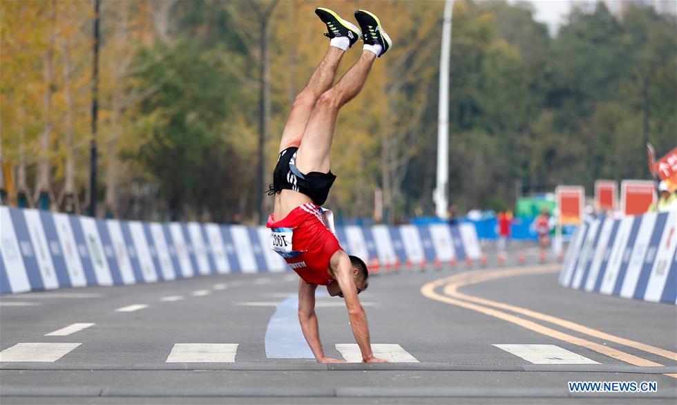 Renato Dorzi of Albania turns a somersault at the finishing line after the men's marathon individual final of track and field at the 7th CISM Military World Games in Wuhan, capital of central China's Hubei Province, Oct. 27, 2019. (Xinhua/Wang Lili)