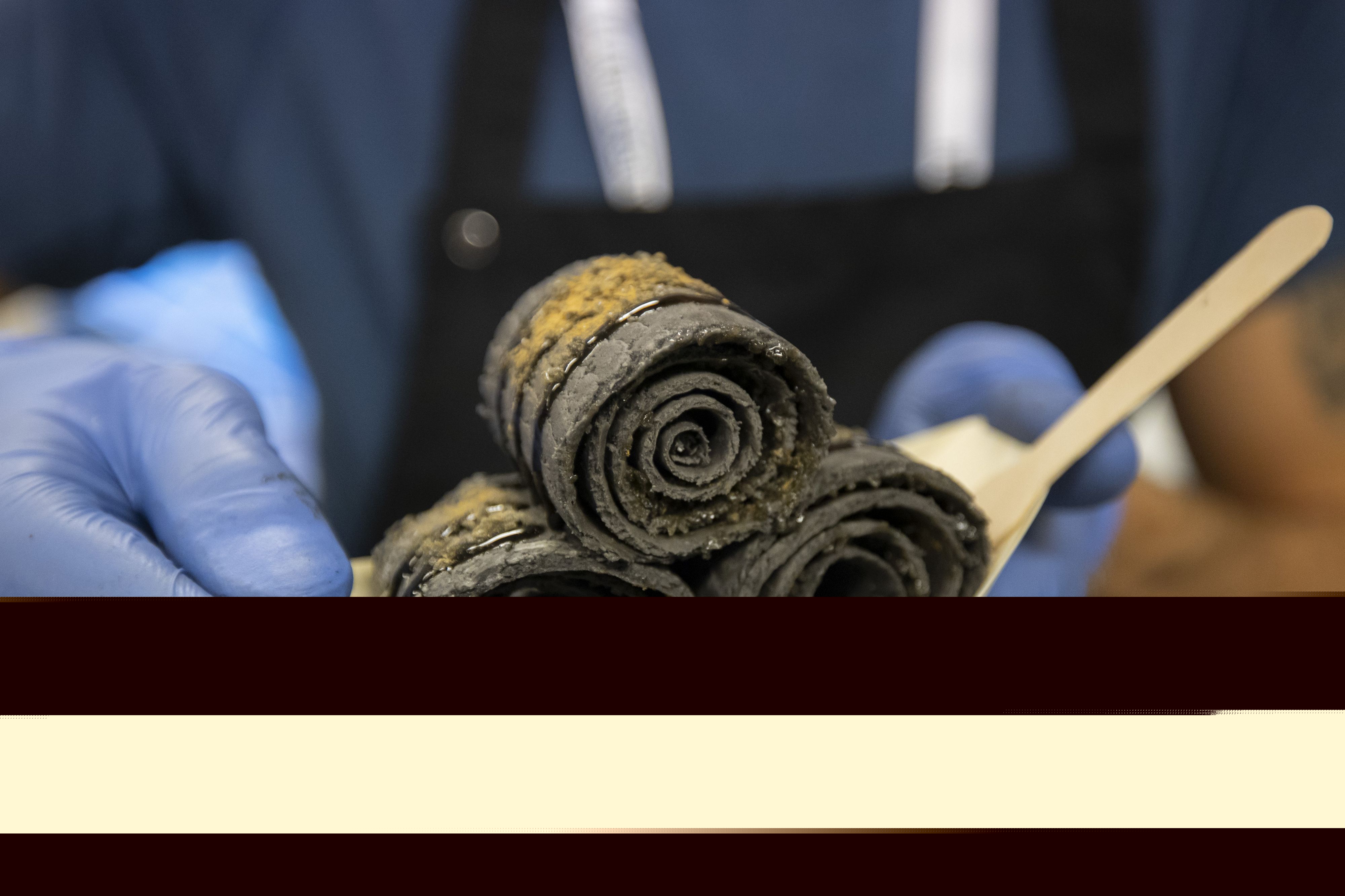 Licorice roll ice cream is made and served at the licorice festival in Helsinki, Finland, on Oct. 27, 2019. The licorice festival of this year featured new licorice flavor tasting, licorice cake decoration, licorice knowledge lecture, etc. (Photo by Matti Matikainen/Xinhua)