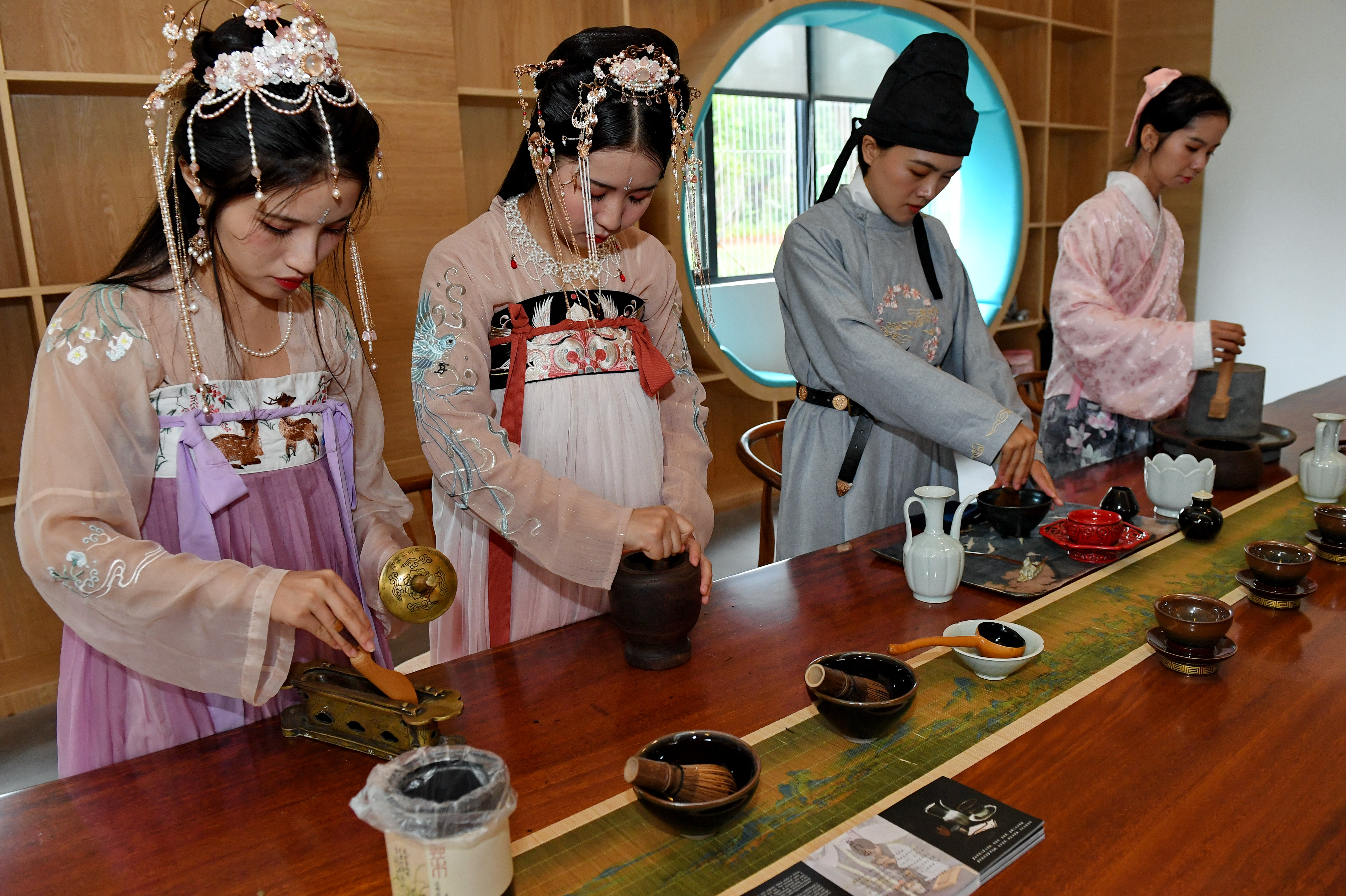Girls in traditional costumes shows a traditional Chinese tea-boiling technique named "Dian Tea" at Masha Town in Jianyang District of Nanping, southeast China's Fujian Province, Oct. 27, 2019. "Dian Tea" is a traditional Chinese tea-boiling technique. Powder of tea leaves are put into a cup and stirred with a bamboo brush in boiling water. When white foam appears, the drink is ready. (Xinhua/Zhang Guojun)