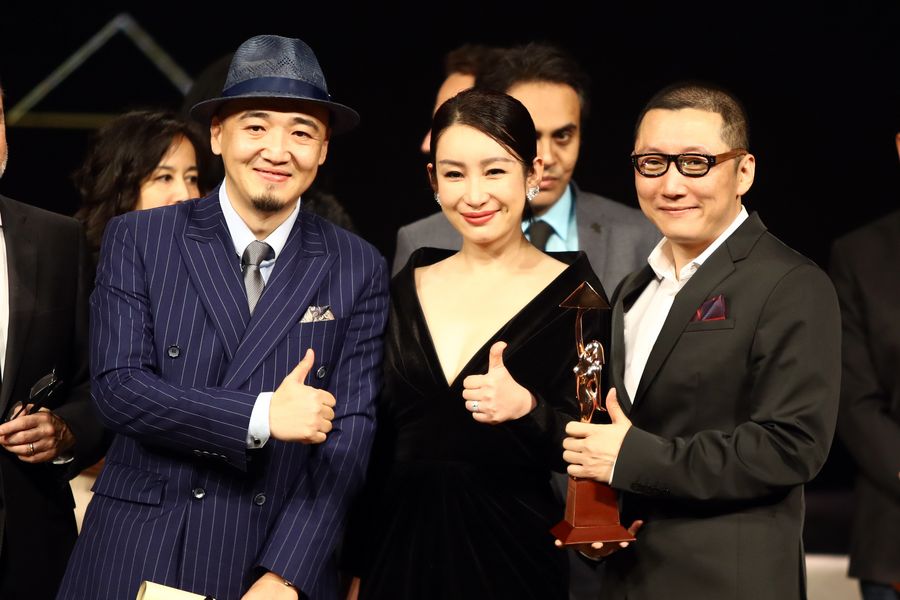 Director Zhang Chong (L) and Zhang Bo (R) of Chinese movie "The Fourth Wall" and Chinese actress Qin Hailu, who is a member of the international jury, pose for a photo during the awarding ceremony of Cairo International Film Festival in Cairo, Egypt, on Nov. 29, 2019. (Xinhua/Ahmed Gomaa)