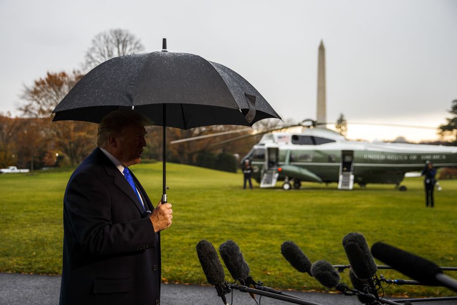 U.S. President Donald Trump speaks to reporters before leaving the White House in Washington D.C., the United States, on Dec. 2, 2019. (Photo by Ting Shen/Xinhua)