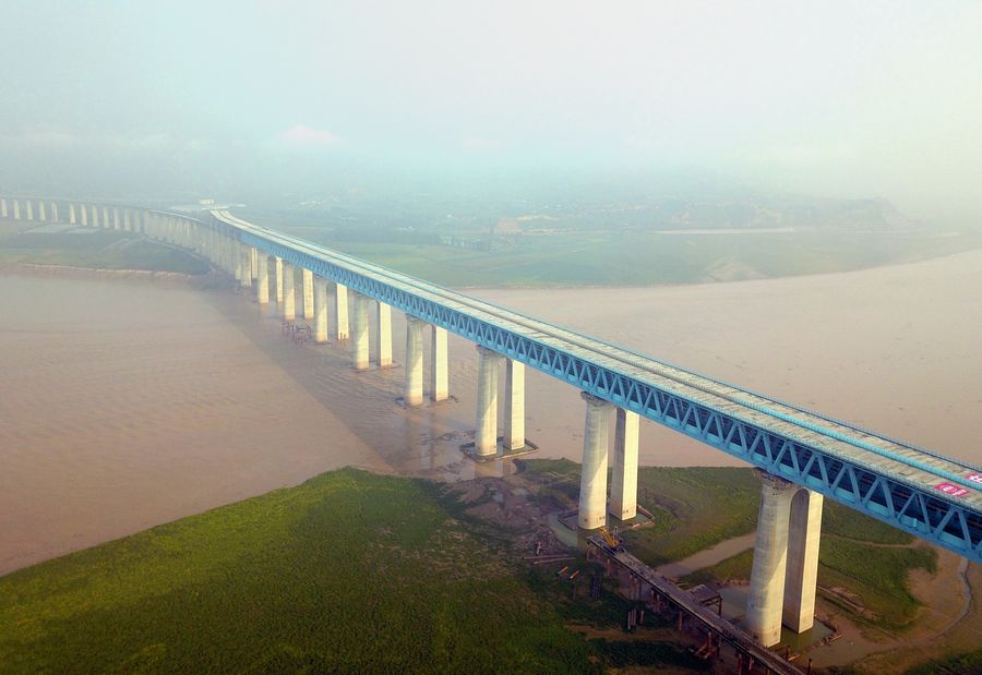 Photo taken on Sept. 18, 2019 shows a Yellow River highway-railway bridge on the Haoji Railway. (Photo by Tang Zhenjiang/Xinhua)