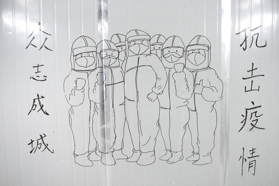 Photo taken on March 4, 2020 shows a drawing on the wall of a corridor at the Leishenshan (Thunder God Mountain) Hospital in Wuhan, central China's Hubei Province. (Xinhua/Fei Maohua)