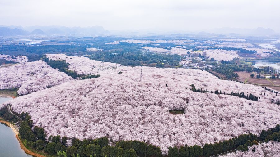 Aerial photo taken on March 12, 2020 shows the scenery of cherry blossoms in Guian New District, southwest China's Guizhou Province. (Xinhua/Tao Liang)