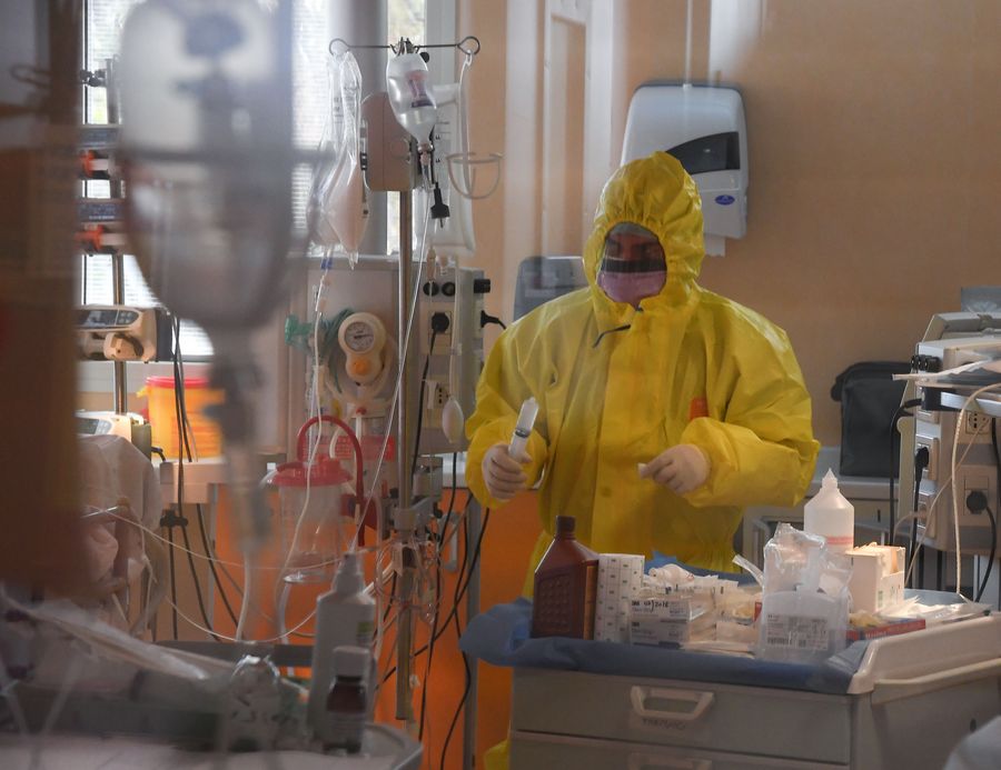 A medical worker treats a patient in the ICU of Istituto Clinico Casalpalocco, in Rome, Italy, March 25, 2020. (Photo by Alberto Lingria/Xinhua)