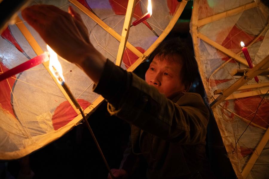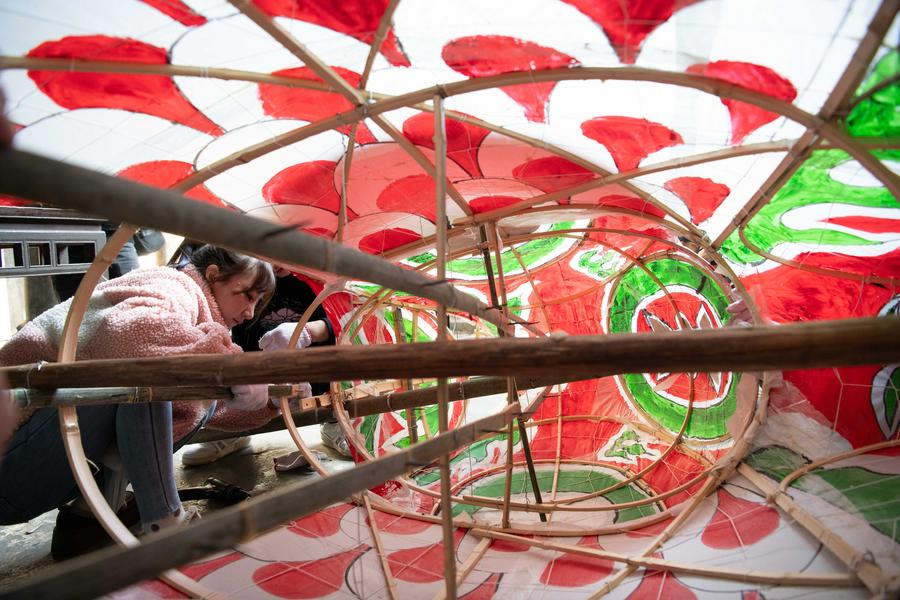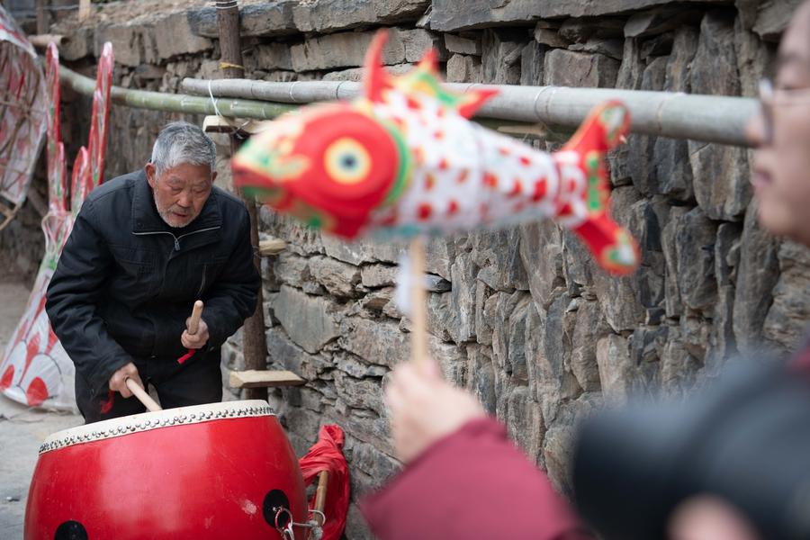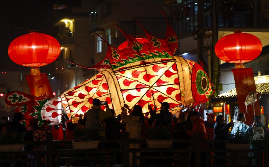 SHEXIAN, Feb. 12 (Xinhua) -- Local villagers in Wangmantian Village of Xitou Town in Shexian County, Huangshan City of east China's Anhui Province, have the tradition to make fish-shaped lanterns to pray for harvest and good fortune and parade with them cheerfully around the Lantern Festival, which falls on the 15th day of the first month of the Chinese lunar calendar, or Feb. 12 this year.