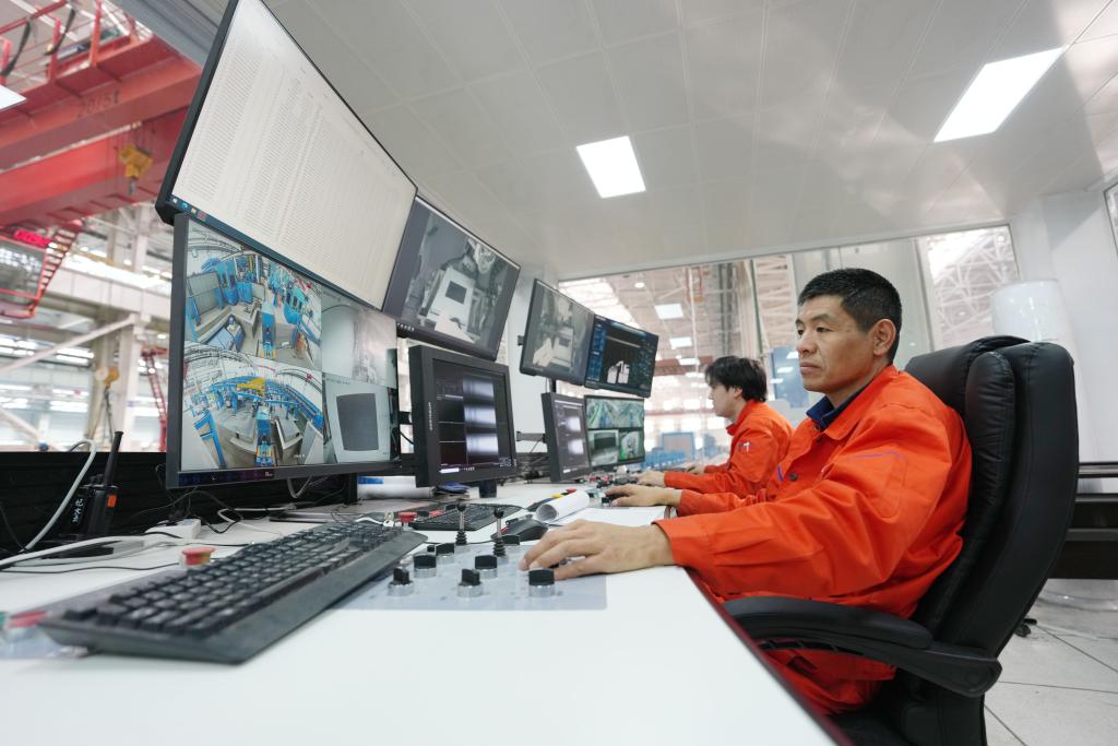 Workers use AI-powered detection for flaw inspection at a pipe factory of Harbin Boiler Co., Ltd. in Harbin, northeast China's Heilongjiang Province, Feb. 26, 2025.(Xinhua/Wang Song)