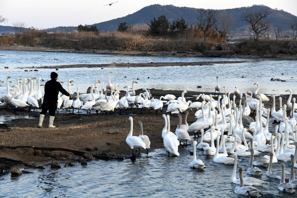 A staff member feeds whooper swans at the Rongcheng Swan National Nature Reserve in east China's Shandong Province, Feb. 14, 2023. (Xinhua/Li Ziheng)