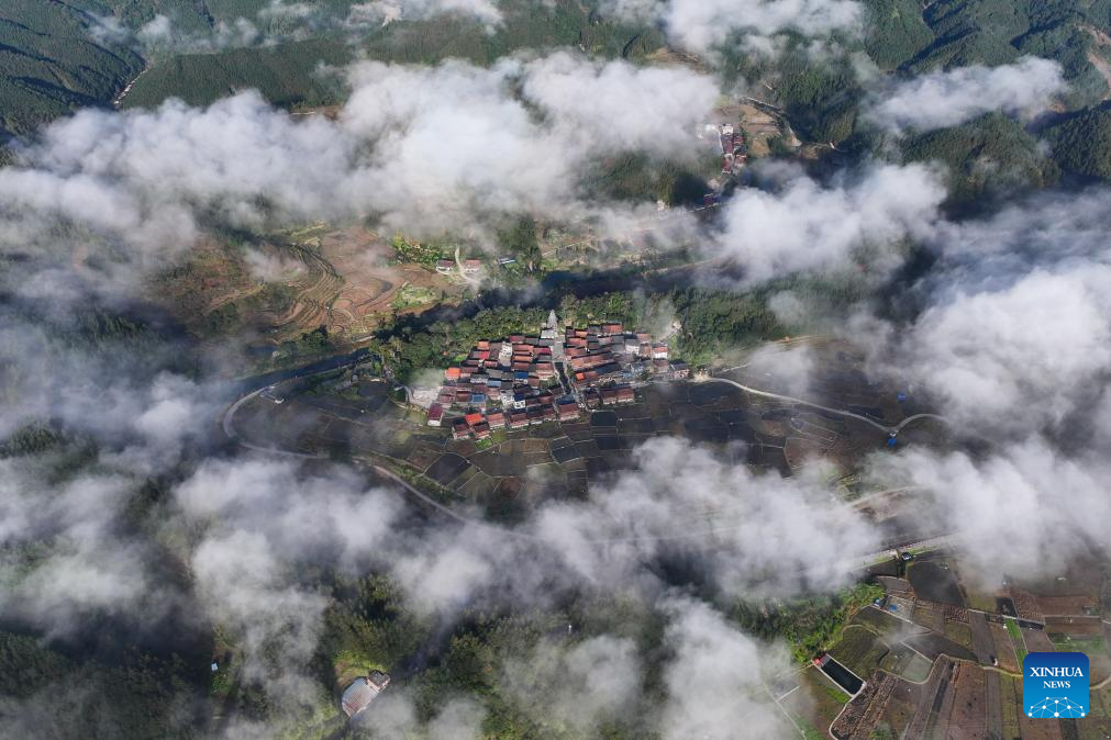An aerial drone photo taken on Nov. 5, 2025 shows a view of Gaoding Village in Dudong Town of Sanjiang Dong Autonomous County, south China's Guangxi Zhuang Autonomous Region.