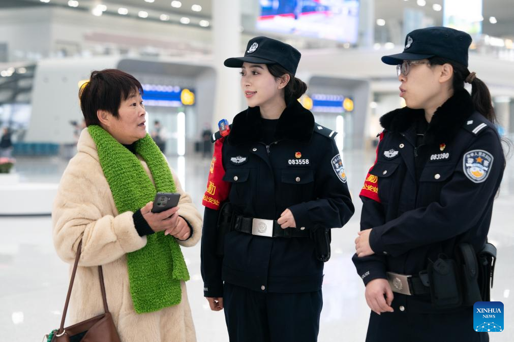 A passenger consults policewomen at the passenger waiting hall of the Hefei West Railway Station in Hefei City, capital of east China's Anhui Province, Dec. 30, 2025.