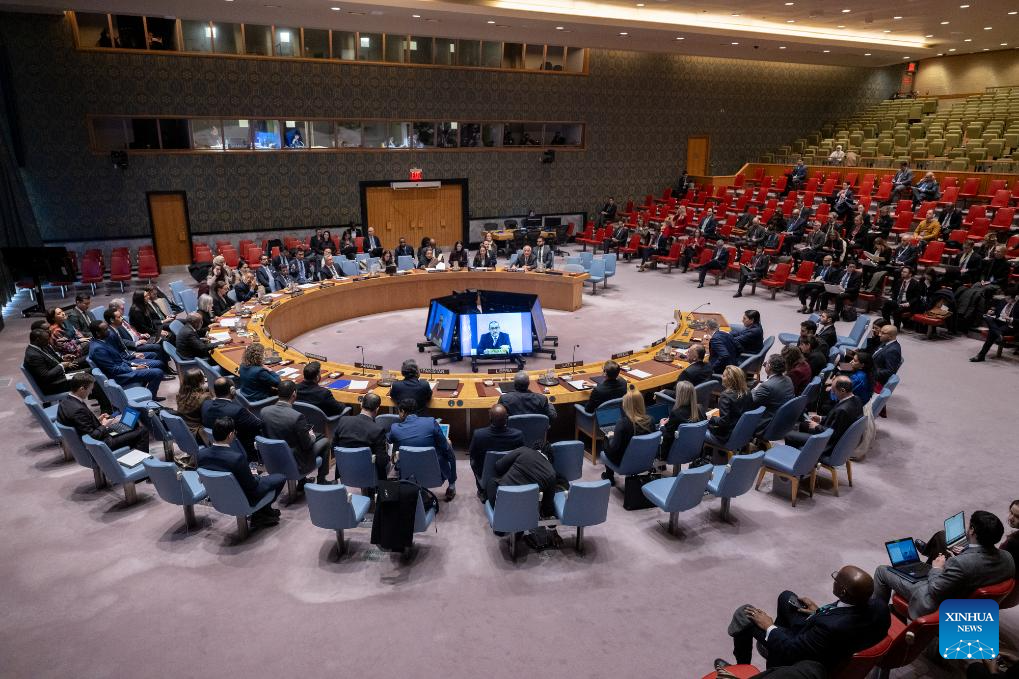 UN Deputy Special Coordinator for the Middle East Peace Process Ramiz Alakbarov (on screens) speaks via a video link at a Security Council meeting at the UN headquarters in New York, Jan. 28, 2026. Alakbarov said Wednesday that there might be a turning point for Gaza, with both profound opportunity and considerable risk. (Manuel Elias/UN Photo/Handout via Xinhua)