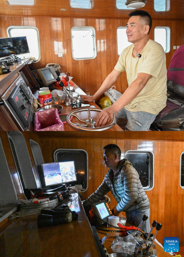 This combo photo shows Huang Ningbo sails to the operation area on Jan. 28, 2026 (above), and he sails back at dawn to the Bohe port in Maoming, south China's Guangdong Province, Jan. 29, 2026 (below). As dawn breaks, the Bohe port in Maoming, south China's Guangdong Province, is already a bustling scene. Captain Huang Ningbo and his brother Huang Ninglang steer their fishing vessel, leading the crew to the sea for fishing operations.