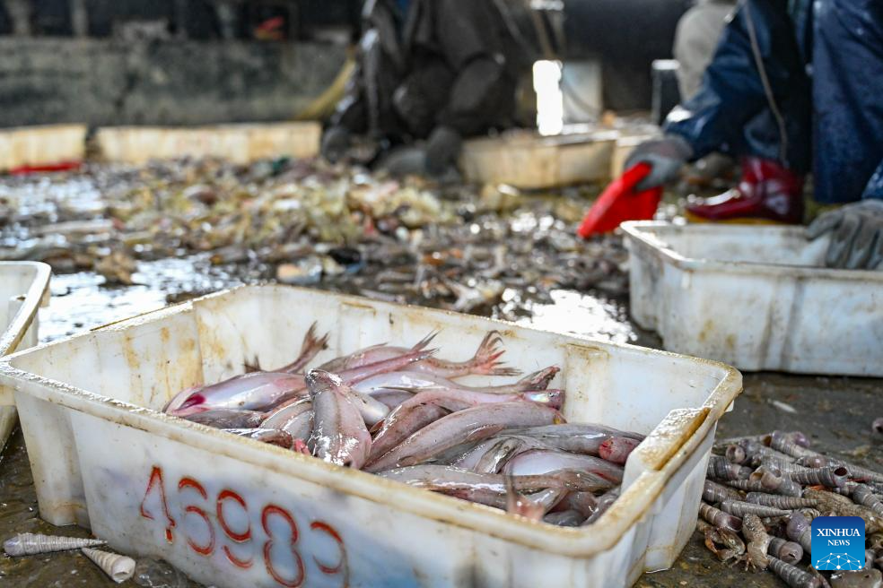 This photo taken on Jan. 28, 2026 shows the sorted-out catches at the vessel. As dawn breaks, the Bohe port in Maoming, south China's Guangdong Province, is already a bustling scene. Captain Huang Ningbo and his brother Huang Ninglang steer their fishing vessel, leading the crew to the sea for fishing operations.