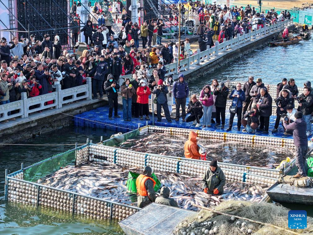 A drone photo shows people attending a winter fishing event in Taizhou, east China's Jiangsu Province, Jan. 31, 2026. (Photo by Tang Dehong/Xinhua)