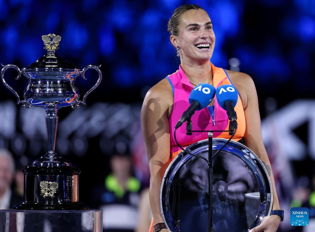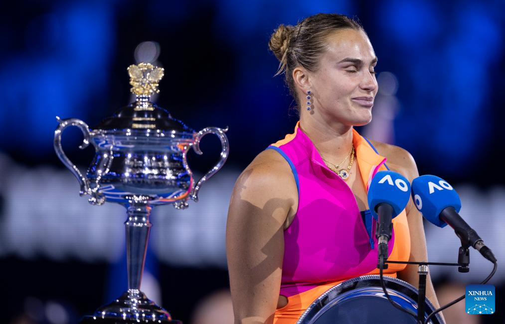 Aryna Sabalenka speaks during the awarding ceremony after the women's singles final between Elena Rybakina of Kazakhstan and Aryna Sabalenka of Belarus at the Australian Open tennis tournament in Melbourne, Australia, Jan. 31, 2026. (Xinhua/Ma Ping)