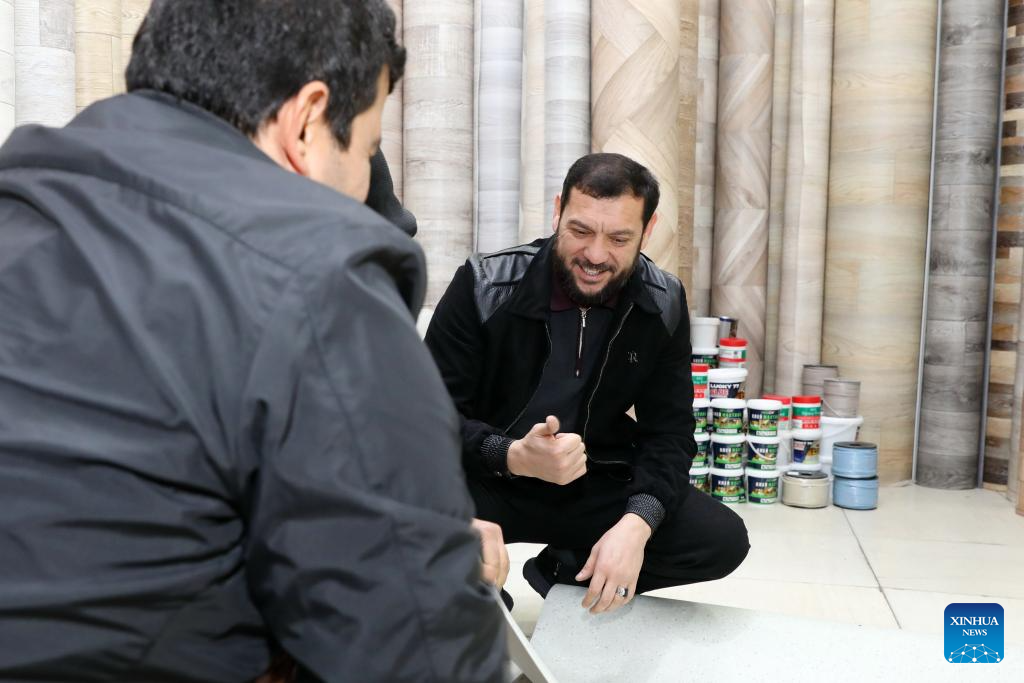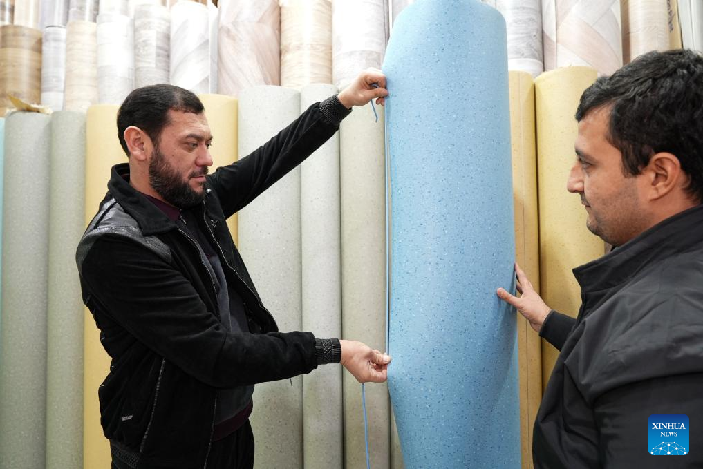 This photo taken on Dec. 12, 2025 shows Jamshid Tashpulatov's building supplies store in Tashkent, Uzbekistan. The home furnishing industry of Guangyuan stands out for its high quality, and its roll flooring products sell well across China and overseas.