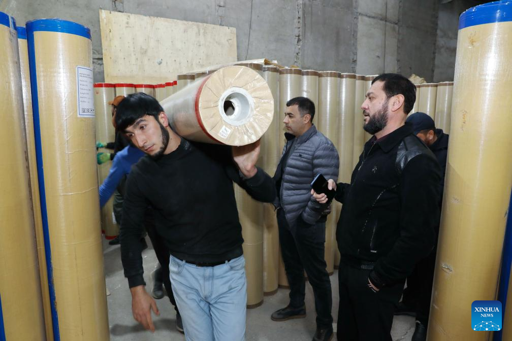 Jamshid Tashpulatov (L), owner of a building supplies store, checks roll flooring materials from Guangyuan of southwest China's Sichuan Province, in Tashkent, Uzbekistan, Dec. 12, 2025. The home furnishing industry of Guangyuan stands out for its high quality, and its roll flooring products sell well across China and overseas.