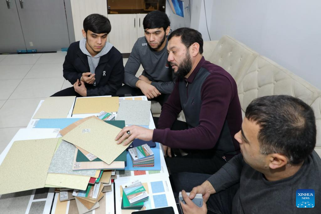 Jamshid Tashpulatov (2nd R), owner of a building supplies store, and his colleagues check roll flooring samples from Guangyuan of southwest China's Sichuan Province, in Tashkent, Uzbekistan, Dec. 12, 2025. The home furnishing industry of Guangyuan stands out for its high quality, and its roll flooring products sell well across China and overseas.
