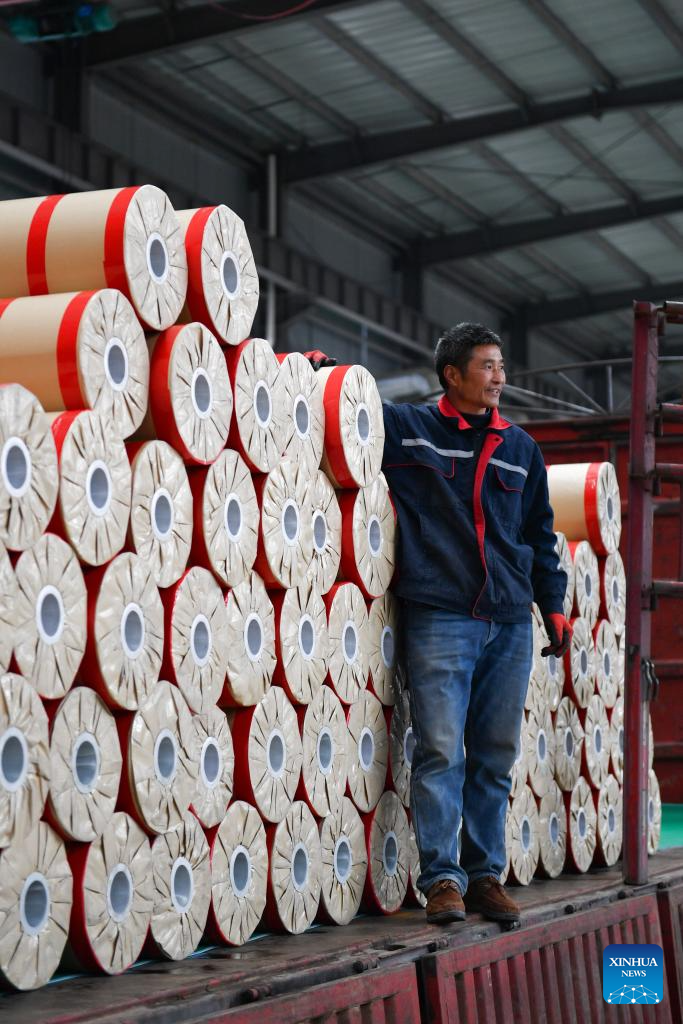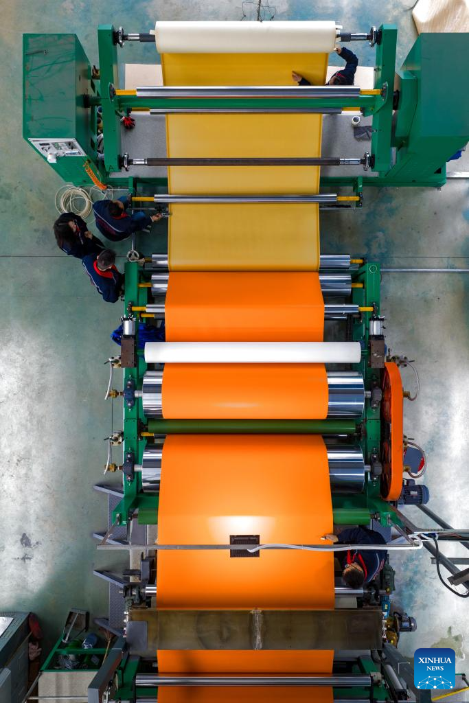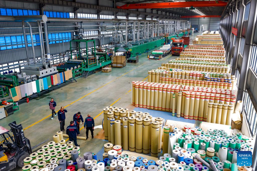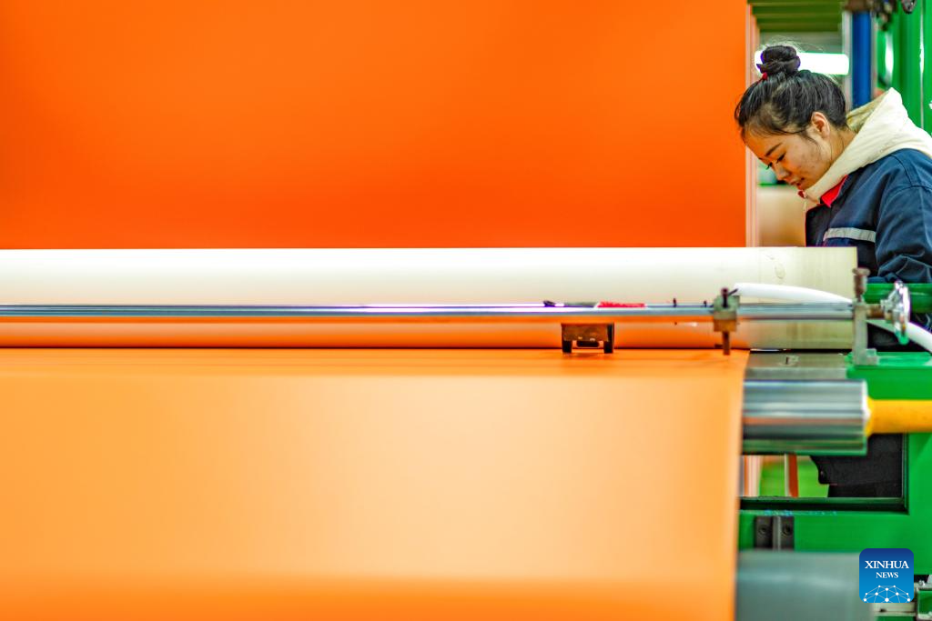 A worker works at a roll flooring manufacturing workshop in Guangyuan, southwest China's Sichuan Province, Dec. 12, 2025. The home furnishing industry of Guangyuan stands out for its high quality, and its roll flooring products sell well across China and overseas.
